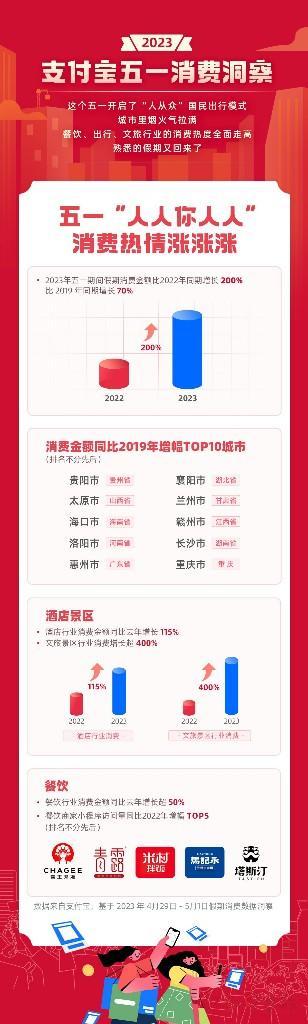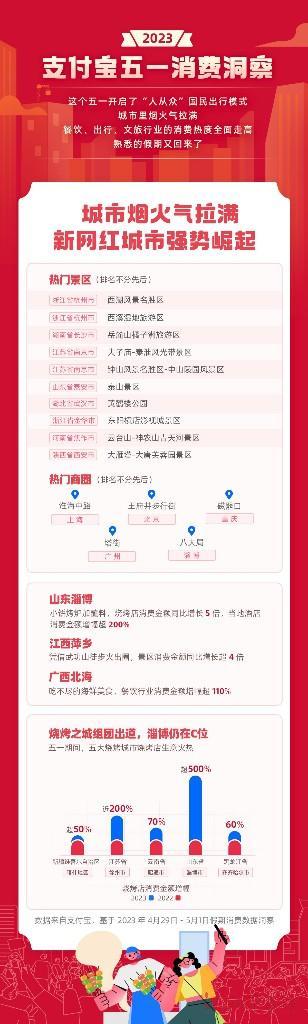 五一假期是全年的重要消費假期,支付寶平臺在4月21日起聯合全國千萬商家啟動“春季消費節”,多管齊下拉消費:消費者掃商家紅包碼領取優惠;激發比去年多1倍的小程序商家參與;用戶上支付寶搜“消費節”,可翻到最高88元紅包以及數百種商家優惠,為商家帶來充滿煙火氣的一個消費節。支付寶五一消費洞察佐證出假期消費強勁的爆發趨勢。同時因為消費需求旺盛而帶動用工需求的增長,形成了循環。為全年的消費增長開了一個好頭。過去3年來的旅游熱情在今年五一迎來集中釋放。支付寶數據顯示,主要消費類大增長而可選消費則呈現大倍數增長。如餐飲行業同比去年增長超5成,而文旅景區行業消費增長超4倍。在支付寶小程序平臺上訪問增幅最大的幾個餐飲品牌均各具地方特色:誕生自云南的新茶飲品牌霸王別姬、上海網紅拉面馬記永、南京連鎖中式點心青露饅頭、延吉延邊美食米村拌飯、福州中式漢堡塔斯汀。商圈依舊是假日消費需求最旺盛的場景之一。支付寶數據顯示,上海淮海中路、北京王府井步行街、重慶磁器口、廣州塔街、淄博八大局是全國熱門商圈。今年五一,全國開啟了“人從眾”國民出行模式,動起來絕對是主旋律。支付寶綜合數據顯示,小長假前3天里使用支付寶交通出行的支付筆數同比去年增長230%,且達到2019年的2.2倍。在支付寶找“租車”自駕出游、找“充電”服務分別是2022年同期的2.4倍和3倍。今年騎單車賞景,在路上揮汗如雨的游客比去年同期也增長了1.5倍,其中上海人對騎行的喜愛在全國居首。受益于旺盛的旅游需求,海外商家也被中國游客的消費熱情驚到了。五一假期出境游人均消費比2019年同期增長達40%。在各大主要目的地市場中,亞洲地區的支付寶境外消費增長最快。中國香港依然是最受歡迎旅游目的地,其次是中國澳門、日本、泰國和韓國。煙火氣拉滿!新網紅城市強勢崛起在游客旅游目的地中,具有地標景區的旅游城市依舊是熱門之選。杭州西湖、西溪濕地、長沙岳麓山、南京夫子廟、中山陵、泰山、武漢黃鶴樓、金華橫店、神農山、西安大雁塔是今年小長假Top10熱度景區。除了老牌的旅游目的地,探索特色潮流小城正成為旅游新趨勢。一系列二三線城市也抓住五一消費高峰,推出城市特色旅游名片,各顯其能招待外地游客。燒烤絕對是今年五一最熱美食關鍵詞,淄博的旅游熱度從五一前就一路走高,支付寶統計數據顯示,消費者在淄博燒烤店消費金額暴漲超5倍,帶動酒店消費金額增幅也超2倍。鑒于淄博接待力飽和,各地紛紛花式拉游客,新疆、江蘇、東北、云南等各地燒烤都卷了起來,江蘇徐州燒烤緊隨淄博之后消費金額增長近2倍。除了出門也有很多人選擇在家里“讓耳朵去旅行”。假期前三天,支付寶「讀書聽書」頻道的用戶數相較前三天增長了近4成,點擊量最高的三本有聲讀物是《三體廣播劇》《停止你的精神內耗》《人生歌單:66首必聽世界名曲》。此外,當假日消費如火如荼的 同時,假期靈活用工的需求也隨之擴大。趁著假期兼職搞錢,正在成為這屆年輕人過五一的流行趨勢。支付寶平臺顯示,五一前夕,在支付寶就業頻道找工作的用戶數環比上漲超6成,劇本殺NPC、牛奶試吃員、民宿管家、婚禮布置人員、古代漢服試衣成為今年五一最受歡迎新奇特職業。