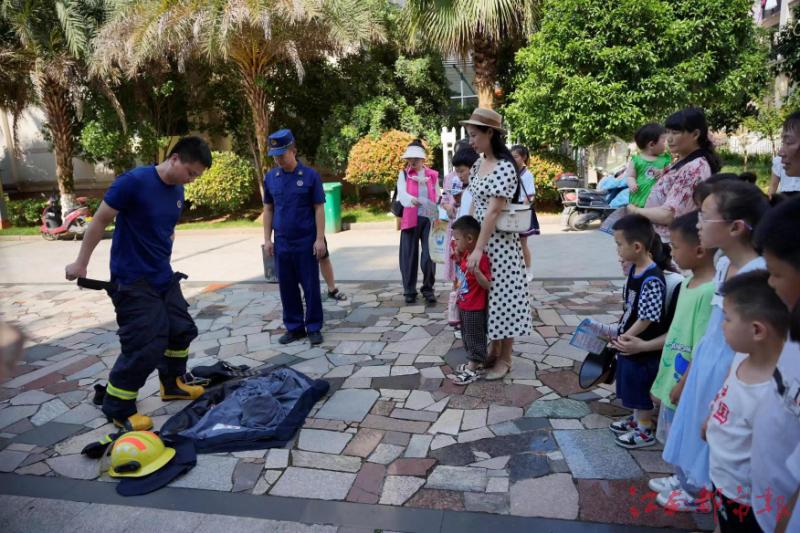 活動現場,消防員為孩子們表演了如何快速穿戴滅火戰斗服,贏得了陣陣掌聲。講解了手提式干粉滅火器的使用方法和演示了火盆滅火,并結合生活實際,用通俗易懂的語言為在場人員講解了家用電器火災的特點、日常防火注意事項、火場中怎樣逃生自救、如何正確報火警等知識;組織參加活動人員體驗了滅火器火盆滅火。隨后,宣傳人員向在場人員發放了小學生教育讀本和宣傳資料,再利用宣傳車播放警示教育視頻,提醒大家要時刻注重防火安全,養成良好的消防安全習慣,生活中注意用火、用電、用氣安全,以免發生火災。