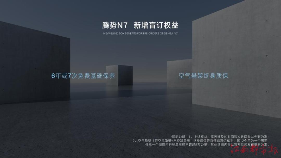 為了給騰勢(shì)N7的首批用戶們帶來(lái)更多福利,在四大豪華專屬權(quán)益基礎(chǔ)上,騰勢(shì)N7新增部分盲訂權(quán)益——即日起下訂騰勢(shì)N7將獲得價(jià)值6000元6年或7次免費(fèi)基礎(chǔ)保養(yǎng),以及空氣懸架終身質(zhì)保。趙長(zhǎng)江也在現(xiàn)場(chǎng)公布了騰勢(shì)N7的產(chǎn)品節(jié)奏,6月中旬可前往門(mén)店實(shí)車體驗(yàn)、下旬上市大定,7-8月正式開(kāi)啟N7交付。