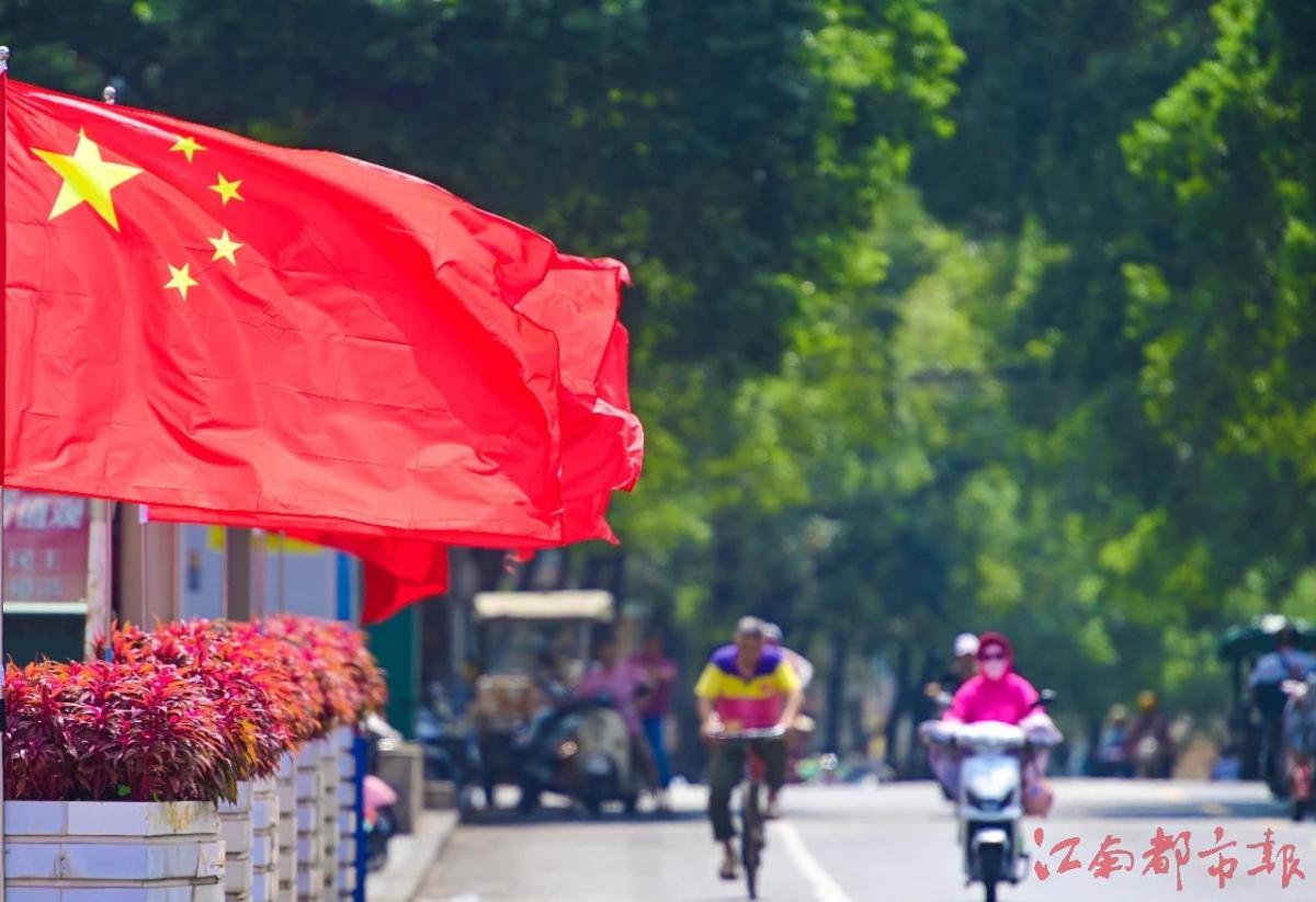 江南都市報訊 蘭春、全媒體記者劉火兵攝影報道:國慶,是全民歡慶的日子,也是對祖國深情告白的時刻。10月1日,贛州市主城區(qū)不少道路懸掛起了鮮艷的五星紅旗,滿街的“中國紅”讓市民們感受到喜慶祥和的節(jié)日氛圍。在迎賓大道路, 不少市民以鮮艷的國旗為背景拍照留念。 為營造節(jié)日氛圍, 表達(dá)愛國情懷,沿路的商家也用小國旗裝扮起了店鋪。