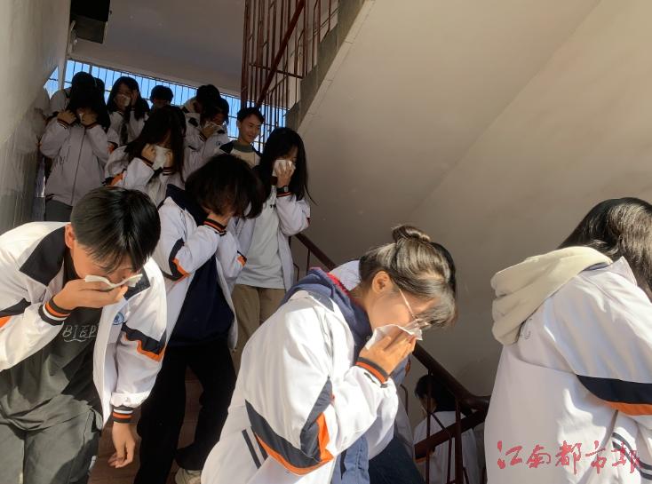 警報聲響起,各班學生在老師的組織下迅速作出反應,低頭、彎腰、俯身、捂住口鼻,快速、有序地從教室按逃生路線進行疏散撤離。不到3分鐘,全校師生全部安全撤離至指定區域。整個逃生疏散演練過程緊湊、有序,達到了預期效果。疏散演練完成后,教官隊隊長劉友凰就滅火器的正確使用方法展開現場教學,“一提,二拔,三握,四壓”,全校師生認真學習并在現場親身體驗。