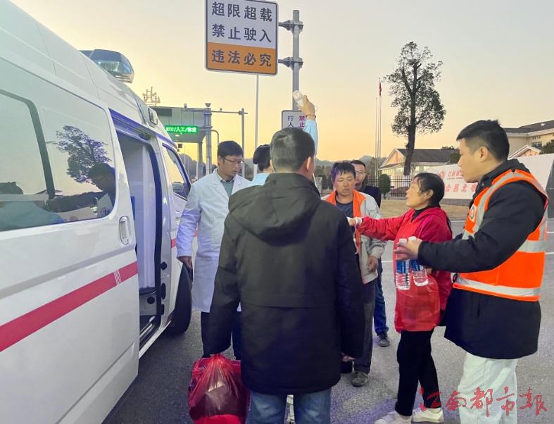 為幫助受傷的群眾爭取救治時間,該站值班人員第一時間帶受傷婦女到就近的衛生院進行簡易的處理,對傷口進行止血、包扎等。處理完之后,立即把受傷群眾帶回會昌北收費站“欲曉驛站”等待救護車到來。此時正值午飯,該站值班人員端上了熱乎乎的飯菜,為受傷群眾補充能量。5分鐘后,救護車及時趕到,該站開啟了救護專用通道加快救護車輛通行。