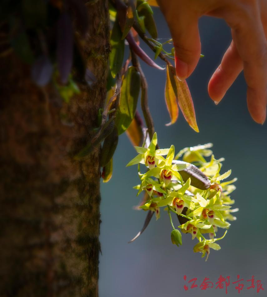 很快,從小面積試種到大范圍種植,栽種在紅豆杉上的鐵皮石斛,不僅種植成功且生長茂盛。尤其是2024年底,謝滿月更驚喜地發現,一些被遺漏采摘花朵的鐵皮石斛自然結果,種莢炸開之后,里面如孢子粉樣的種子隨風飄散,竟然在紅豆杉的樹干上發出了一片片幼小的鐵皮石斛新芽。“這很神奇,鐵皮石斛種子的發育率很低,幾乎不能自然生長,連專家都說,目前在別的地方,還沒有發現鐵皮石斛在沒有人為的干預下,能自然繁育出種苗。”