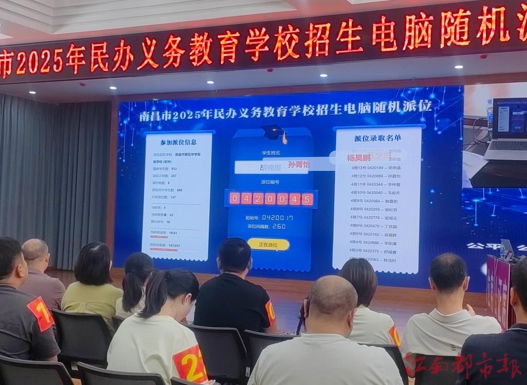 ”現在我們進行1號學校江西科技學院附屬中學(初中)的派位,填報人數777,派位計劃230個,雙(多)胞胎捆綁后派位碼數量764個,請1號簽兩位家長代表上來進行操作……“7月16日上午9時許,南昌市2025年民辦義務教育學校招生電腦隨機派位活動正式啟動。當日上午,27所民辦義務教育學校的派位持續了一個半小時,現場38位家長代表輪流上臺進行電腦派位操作,同步公布錄取學生及分班情況。