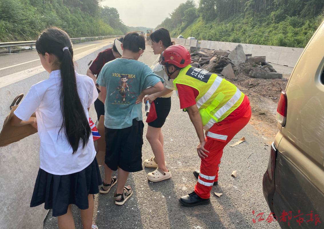 7月15日16時50分,余江中隊值班室的電話驟然響起。“K672浙江方向有輛商務(wù)車拋錨,車上有多名乘客滯留,請立即前往救援!”接到交警部門的緊急通知后,該中隊迅速啟動高溫天氣救援預(yù)案,中隊長董嚴偉帶領(lǐng)救援員王永貴駕駛預(yù)警車火速出發(fā)。車窗外熱浪翻滾,柏油路面蒸騰著熱氣,車內(nèi)隊員們已提前檢查好防暑藥品和飲用水,一場與高溫的較量就此展開。