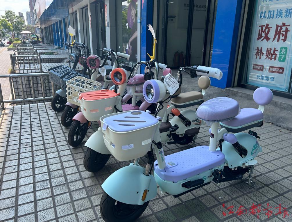 7月31日上午,記者來到南昌市洪城路,這里電動自行車門店比較集中,時不時有顧客進店詢問價格,店內(nèi)整齊擺放著嶄新的電動自行車。記者注意到,大部分電動自行車還是“舊國標”產(chǎn)品,旁邊均張貼著寫有“以舊換新”“政府補貼”等字樣的宣傳廣告,基本所有門店均宣稱“以舊換新購買方式可以省500元至1000元”。