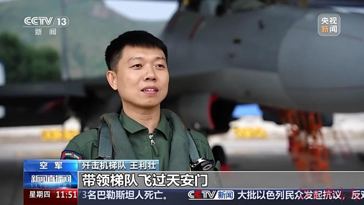 殲擊機梯隊 王利壯:我在這次任務中,飛的是殲擊機梯隊的長機位置。作為殲擊機梯隊的長機,首先它要有穩定性;第二要有柔和性,帶領梯隊飛過天安門,肯定是感到無比自豪與激動。在通過天安門的時候,可以俯瞰繁華的城市和飄揚的紅旗,能看到祖國繁榮富強的同時,又深刻感受到自己肩負著責任。我和戰友們將始終牢記黨和人民的重托,不斷錘煉過硬的飛行技能,為國防貢獻自己的全部力量。