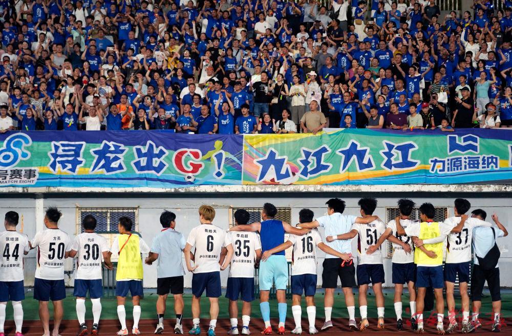 7月20日,九江隊球員在賽后與球迷互動。新華社記者 萬象 攝