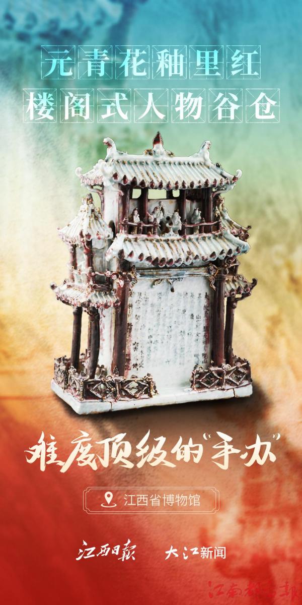 元青花釉里紅樓閣式人物谷倉(cāng),是中國(guó)唯一一件有明確紀(jì)年的樓閣式谷倉(cāng),列入《首批禁止出國(guó)(境)展覽文物目錄》。它還是目前僅見(jiàn)的重檐廡殿頂樓閣式谷倉(cāng),分為上下二層,塑有18個(gè)姿態(tài)各異的人物俑,或手執(zhí)掌扇,或懷抱琵琶,或甩袖起舞。它是一件陪葬品,背面159字的青花銘文詳細(xì)記載了墓主身份信息,堪稱“元代瓷器的身份證”。青花、釉里紅、青白釉與紅釉四種釉彩工藝在一件瓷器上完美融合,這種高超技藝極為罕見(jiàn),充分展現(xiàn)了景德鎮(zhèn)瓷業(yè)的雄厚實(shí)力。